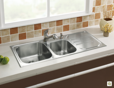 商品编号:K-3268T-2FD 名称:贝丽大小槽台上厨盆(珍珠银+抗油)